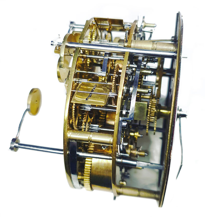 Die Uhrwerke werden von mir im Rahmen einer Reparatur komplett zerlegt und gereinigt. Sämtliche Räder, Triebe und Hebel werden auf Funktion geprüft, die Zapfen werden aufgearbeitet, Lager werden den Zapfen angepasst – ansonsten ersetzt. Auch werden die Zugfedern geprüft und bei Defekt ersetzt. Ebenso prüfe ich die Paletten und arbeite sie gegebenenfalls nach. Anschließend wird die Uhr von mir fachgerecht montiert, gefettet und geölt.